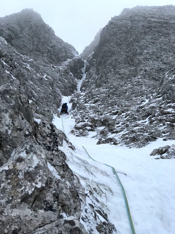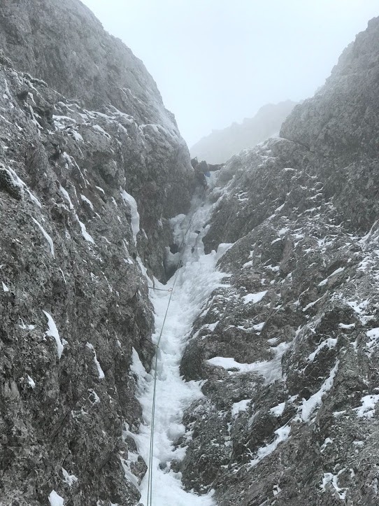 Vstopni stožec ni obetal, a že nekaj metrov nad njim so razmere za jodlanje. Dokler Beno ne najde dobrega mesta za štant, ima prvi cug delno štajerski priokus. Potem naravnost pred nama vidiva zajedo v Mejaški smeri, desno pa zastrašujoč previs Strašila. Greva naravnost in pod rahlo previsno zajedo še enkrat štantava. Ne moreva se odločiti ali zgleda bolj zastrašujoča od daleč ali od blizu. Beno se poda v akcijo, mirno in trezno napreduje pod previs. Jaz drgetam na štantu in se sprašujem kaj toliko menca. Zbaše se čez in zavriska od veselja. Piha vse močneje in pršni plazovi so vse bolj pogosti. Pod previsom me zasipava in hitro mi postane jasno zakaj je toliko trajalo, pod nogami kmalu ni več prav dosti, levo ali desno dereza zapraska po skali, cepin pa išče luknje v ledu. Zasnežen kot snežak se tudi jaz dokaj elegantno zbašem čez v še bolj odurne vremenske razmere. Megla je še bolj gosta, piha in prenaša grobe snežne kristale, ki bičajo obraz. Pred nama je še en krajši skok, nato pa lažja grapa do naslednjega štanta. Beno nekaj govori, a slišim samo svojo vetrovko, ki poka v vetru. Na naslednjem štantu pustiva not profilca, bi ga bilo greh jemati ven. Zdi se nama, da do vrha ni več dosti. Vmes imava spet celo nekaj metrov vodnega ledu. Počasi se svet odpira in že gaziva po vršnih pobočjih. Sonce se hoče prebiti čez oblake, a ne zmore. Zloživa vrvi in zagaziva čez zadnje mučne metre do grebena, nato pa po grebenu proti vrhu.