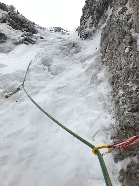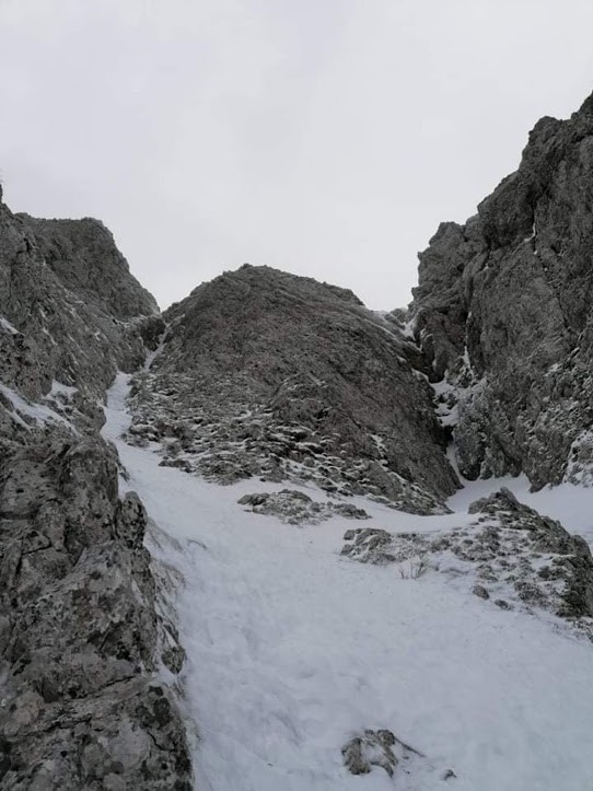 Tokrat kreneva malo bolj zgodaj, a še zmeraj prepozno, da bi prehitela načelnika, katerega avto zagledava zjutraj na parkingu. Pot oziroma cesta na Korošico je zame vedno eno samo matranje, že kot otrok je nisem maral in sem vedno raje šel po lovski. Sneg se začne pri drugem ali tretjem ovinku, mraza ni in »švicava fuL«. Začneva se vzpenjati pod steno, v Prontarski sta že dve navezi, ena je še pod vstopom, skratka gužva. Midva pa pridno rineva navzgor, izbrane smeri še ne vidiva. Potem pa prideva za vogal in nad nama v oči bode kratka zaledenela zajeda. Sicer že od daleč zgleda zaj*bano, ampak najin moto je bil »probat ni greh«.