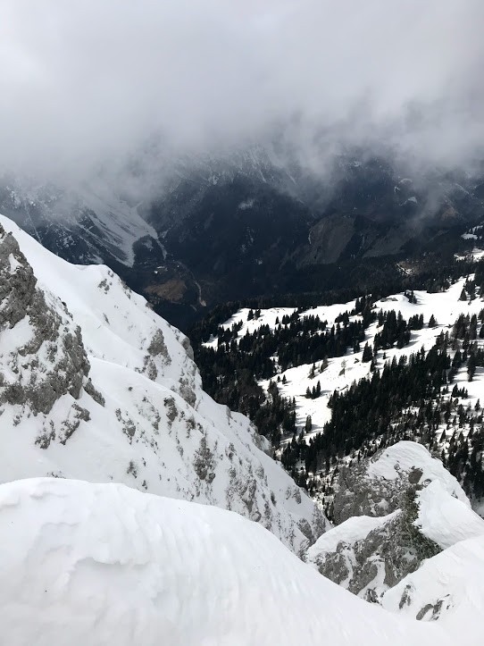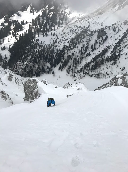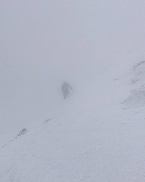 Piha vse močneje, vidljivost je praktično nič, če ne bi bilo sledi predhodnikov bi bilo še zelo zanimivo. Vlečeva se kot megla, a kaj kmalu gre samo še navzdol, aleluja. Zaradi slabe vidljivosti sva se že prej odločila za sestop na Kofce.